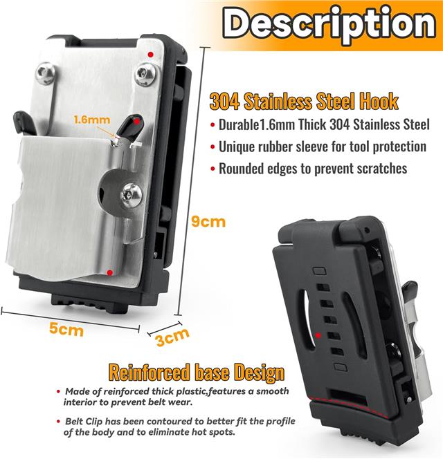 Features a durable, thickened plastic base with a smooth interior to reduce belt wear. The spring-loaded clasp includes a secure locking mechanism to fit belts up to 3.4 cm (1.3 inches) wide without slipping.
